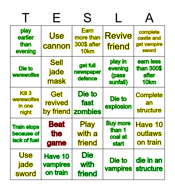 This bingo card has 25 words: Beat the game, Die with friend, get full newspaper defence, Use jade sword, complete castle and get vampire sword, play earlier than evening, Die to werewolfes, Use cannon, Die to explosion, Play with a friend, play in evening (pass sunfall), Kill 3 werewolfes in one night, Buy more than 1 coal at start, Have 10 outlaws on train, Sell jade mask, die in an structure, Complete an structure, Earn more than 300$ after 10km, earn less than 300$ after 10km, Get revived by friend, Die to fast zombies, Have 10 vampires on train, Train stops because of lack of fuel, Revive friend and Die to vampires.