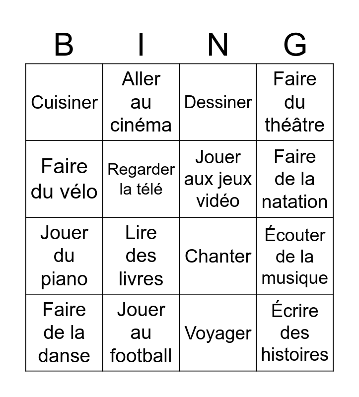 This bingo card has 16 words: Jouer au football, Écouter de la musique, Dessiner, Cuisiner, Jouer du piano, Aller au cinéma, Chanter, Voyager, Faire du vélo, Regarder la télé, Faire de la danse, Faire du théâtre, Lire des livres, Faire de la natation, Jouer aux jeux vidéo and Écrire des histoires.
