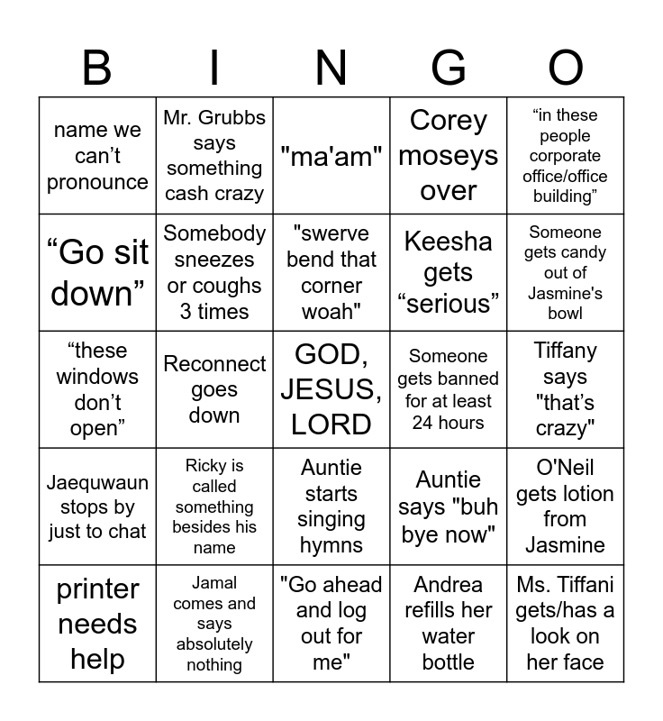 This bingo card has a free space and 24 words: Ricky is called something besides his name, Jamal comes and says absolutely nothing, "swerve bend that corner woah", printer needs help, “in these people corporate office/office building”, name we can’t pronounce, “Go sit down”, Mr. Grubbs says something cash crazy, Someone gets banned for at least 24 hours, Auntie starts singing hymns, Keesha gets “serious”, “these windows don’t open”, Auntie says "buh bye now", O'Neil gets lotion from Jasmine, Somebody sneezes or coughs 3 times, Andrea refills her water bottle, Tiffany says "that’s crazy", "ma'am", Someone gets candy out of Jasmine's bowl, Reconnect goes down, Ms. Tiffani gets/has a look on her face, Jaequwaun stops by just to chat, Corey moseys over and "Go ahead and log out for me".