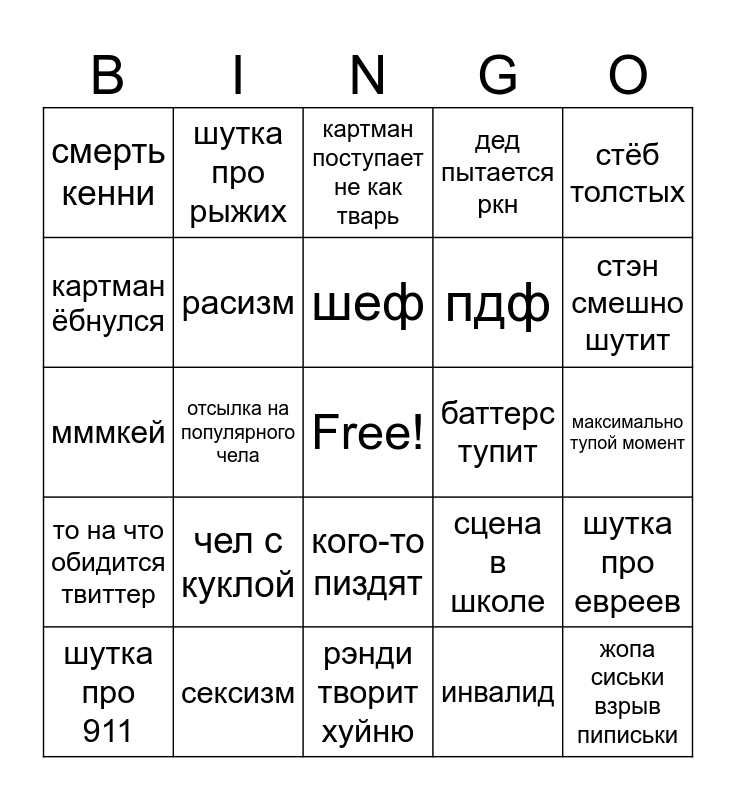 This bingo card has a free space and 24 words: чел с куклой, сексизм, шеф, шутка про 911, стёб толстых, смерть кенни, картман ёбнулся, шутка про рыжих, баттерс тупит, кого-то пиздят, пдф, мммкей, сцена в школе, шутка про евреев, расизм, инвалид, максимально тупой момент, картман поступает не как тварь, стэн смешно шутит, отсылка на популярного чела, жопа сиськи взрыв пиписьки, то на что обидится твиттер, дед пытается ркн and рэнди творит хуйню.