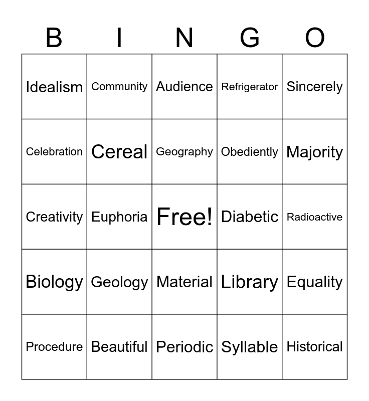 This bingo card has a free space and 30 words: Beautiful, Delicious, Euphoria, Adventure, Idealism, Audience, Cereal, Material, Diabetic, Periodic, Radioactive, Historical, Syllable, Familiar, Majority, Superhero, Library, Biology, Geology, Sincerely, Creativity, Responsibility, Community, Obediently, Celebration, Refrigerator, Equality, Procedure, Geography and Curiosity.