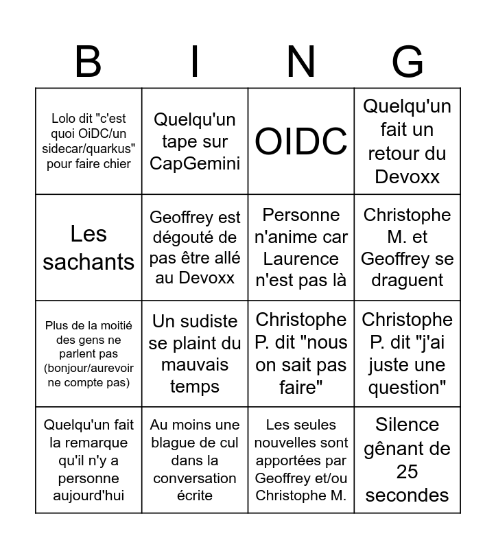 This bingo card has 16 words: Au moins une blague de cul dans la conversation écrite, Christophe P. dit "j'ai juste une question", OIDC, Lolo dit "c'est quoi OiDC/un sidecar/quarkus" pour faire chier, Plus de la moitié des gens ne parlent pas (bonjour/aurevoir ne compte pas), Quelqu'un tape sur CapGemini, Christophe P. dit "nous on sait pas faire", Les seules nouvelles sont apportées par Geoffrey et/ou Christophe M., Les sachants, Geoffrey est dégouté de pas être allé au Devoxx, Quelqu'un fait la remarque qu'il n'y a personne aujourd'hui, Quelqu'un fait un retour du Devoxx, Un sudiste se plaint du mauvais temps, Christophe M. et Geoffrey se draguent, Personne n'anime car Laurence n'est pas là and Silence gênant de 25 secondes.