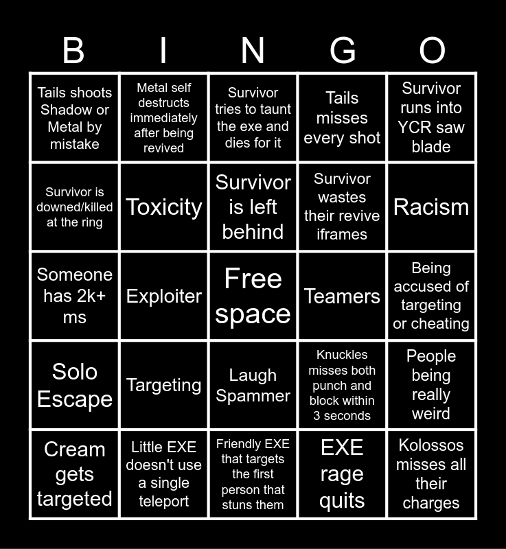 This bingo card has a free space and 24 words: Targeting, Little EXE doesn't use a single teleport, Survivor is left behind, Cream gets targeted, Survivor runs into YCR saw blade, Tails shoots Shadow or Metal by mistake, Survivor is downed/killed at the ring, Metal self destructs immediately after being revived, Teamers, Laugh Spammer, Survivor wastes their revive iframes, Someone has 2k+ ms, Knuckles misses both punch and block within 3 seconds, People being really weird, Toxicity, EXE rage quits, Being accused of targeting or cheating, Survivor tries to taunt the exe and dies for it, Racism, Exploiter, Kolossos misses all their charges, Solo Escape, Tails misses every shot and Friendly EXE that targets the first person that stuns them.