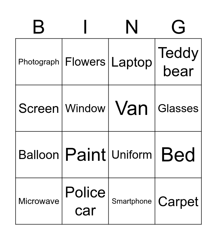 This bingo card has 16 words: Police car, Bed, Laptop, Photograph, Balloon, Flowers, Uniform, Smartphone, Screen, Window, Microwave, Teddy bear, Paint, Glasses, Van and Carpet.