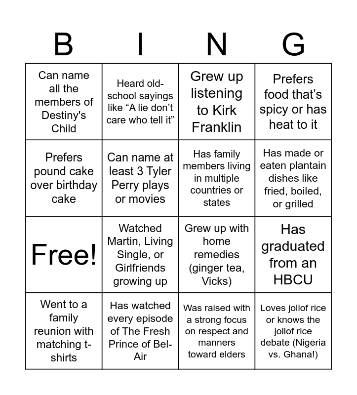 This bingo card has 20 words: Has graduated from an HBCU, Is a member of the Divine Nine, Grew up listening to Kirk Franklin, Is a part of the "beyhive", Went to a family reunion with matching t-shirts, Prefers pound cake over birthday cake, Has watched every episode of The Fresh Prince of Bel-Air, Can name all the members of Destiny's Child, Free!, Heard old-school sayings like “A lie don’t care who tell it”, Watched Martin, Living Single, or Girlfriends growing up, Grew up with home remedies (ginger tea, Vicks), Can name at least 3 Tyler Perry plays or movies, Loves jollof rice or knows the jollof rice debate (Nigeria vs. Ghana!), Has family members living in multiple countries or states, Bakes sweet potato pie over pumpkin pie on Thanksgiving, Has made or eaten plantain dishes like fried, boiled, or grilled, Prefers food that’s spicy or has heat to it, Was raised with a strong focus on respect and manners toward elders and Has visited a Caribbean island (Jamaica, Barbados, Trinidad, etc.).