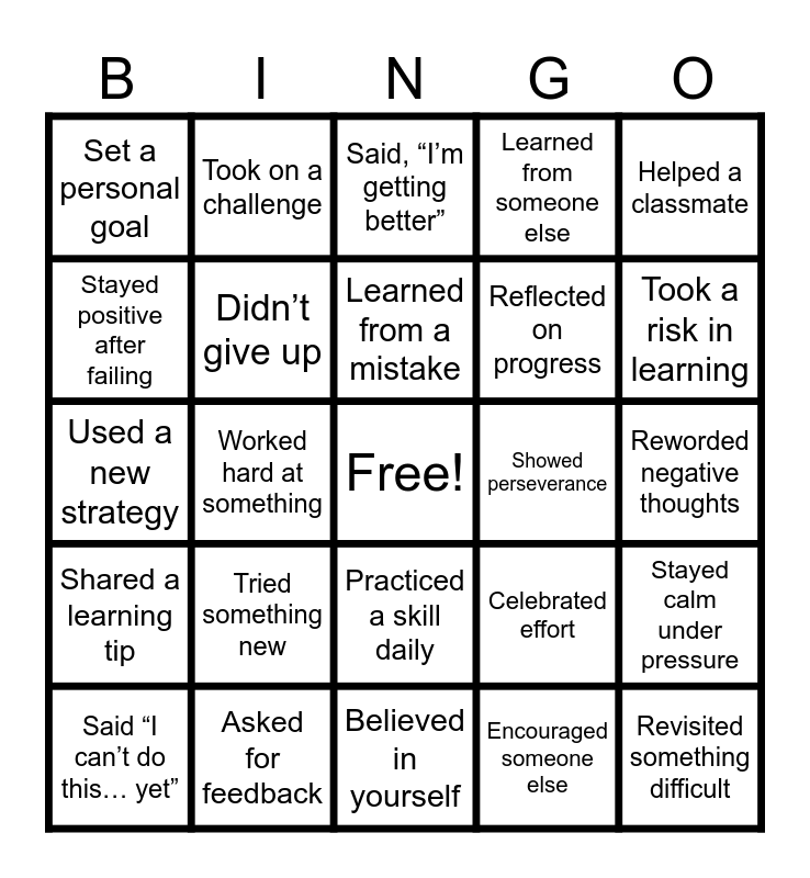 This bingo card has a free space and 24 words: Tried something new, Asked for feedback, Learned from a mistake, Said “I can’t do this… yet”, Helped a classmate, Set a personal goal, Stayed positive after failing, Took on a challenge, Showed perseverance, Practiced a skill daily, Reflected on progress, Used a new strategy, Celebrated effort, Stayed calm under pressure, Didn’t give up, Encouraged someone else, Reworded negative thoughts, Said, “I’m getting better”, Took a risk in learning, Worked hard at something, Revisited something difficult, Shared a learning tip, Learned from someone else and Believed in yourself.