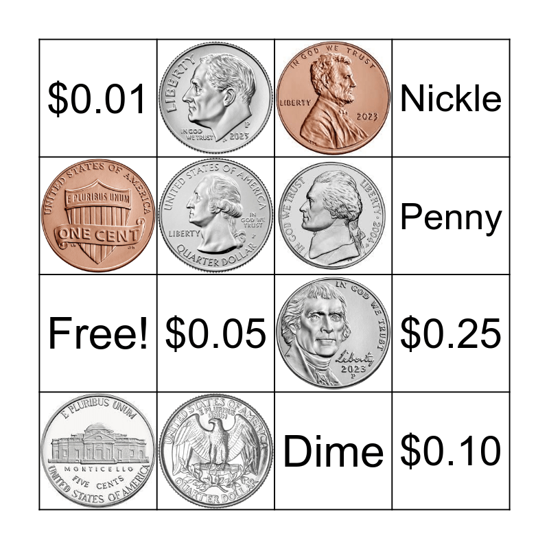 This bingo card has 11 images and 9 words: $0.25, $0.01, Free!, $0.05, $0.10, Penny, Nickle, Dime and Quarter.
