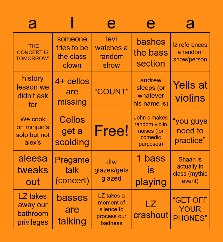 This bingo card has a free space and 29 words: DTW crashout, basses are talking, levi watches a random show, someone plays on a rest, lz references a random show/person, “THE CONCERT IS TOMORROW”, 4+ cellos are missing, “COUNT”, John c makes random violin noises (for comedic purposes), Shaan is actually in class (mythic event), LZ takes away our bathroom privileges, Cellos get a scolding, LZ crashout, “GET OFF YOUR PHONES”, We cook on minjun’s solo but not alex’s, “we need people to set up chairs at the concert”, LZ takes a moment of silence to process our badness, 1 bass is playing, Yells at violins, aleesa tweaks out, Pregame talk (concert), Talks about his daughter, andrew sleeps (or whatever his name is), “you guys need to practice”, history lesson we didn’t ask for, someone tries to be the class clown, dtw glazes/gets glazed, bashes the bass section and EVERY CELLO PLAYER HAS A CELLO WOOOOO.