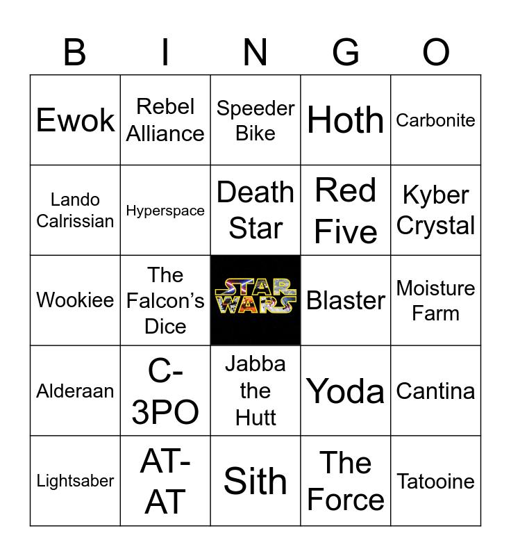 This bingo card has a free space and 60 words: Carbon Freezing, AT-AT, Wampa, Alderaan, The Force, Blue Milk, Hyperspace, Jawas, Red Five, Endor, Hoth, Clone, Lando Calrissian, Padawan, Twin Suns, Ewok, Tatooine, Carbonite, Force Ghost, Death Star, Blaster, Speeder Bike, Lightsaber, Cantina, Admiral Ackbar, R2-D2, Tuken Raider, Stormtrooper, Kyber Crystal, Han Solo, TIE Fighter, Naboo, Mandalorian, The Emperor, Rebel Alliance, Trash Compactor, Thermal Detonator, The Falcon’s Dice, Droid, Wookiee, Bounty Hunter, C-3PO, Moisture Farm, Mon Mothma, Yoda, Imperial March, Dagobah, The Millennium Falcon, Hologram, Jabba the Hutt, Sith, Jedi, Grogu, Princess Leia, Greedo, Proton Torpedo, Sarlacc, X-Wing, Yub Nub and Boba Fett.