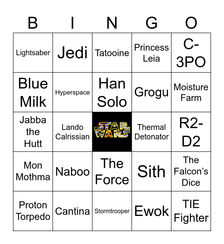 This bingo card has a free space and 60 words: Kyber Crystal, Cantina, AT-AT, Mon Mothma, Ewok, Twin Suns, Hyperspace, Jawas, Grogu, Sarlacc, Princess Leia, Droid, Blue Milk, The Emperor, Wookiee, Lightsaber, TIE Fighter, C-3PO, Imperial March, Han Solo, Thermal Detonator, Tatooine, Proton Torpedo, The Falcon’s Dice, Mandalorian, Red Five, Greedo, Alderaan, Moisture Farm, Force Ghost, Boba Fett, Death Star, Tuken Raider, Bounty Hunter, Jedi, The Millennium Falcon, Dagobah, Lando Calrissian, Blaster, Jabba the Hutt, X-Wing, Naboo, R2-D2, Rebel Alliance, Sith, Padawan, Clone, Speeder Bike, Yub Nub, The Force, Stormtrooper, Yoda, Admiral Ackbar, Endor, Carbonite, Hoth, Wampa, Trash Compactor, Hologram and Carbon Freezing.