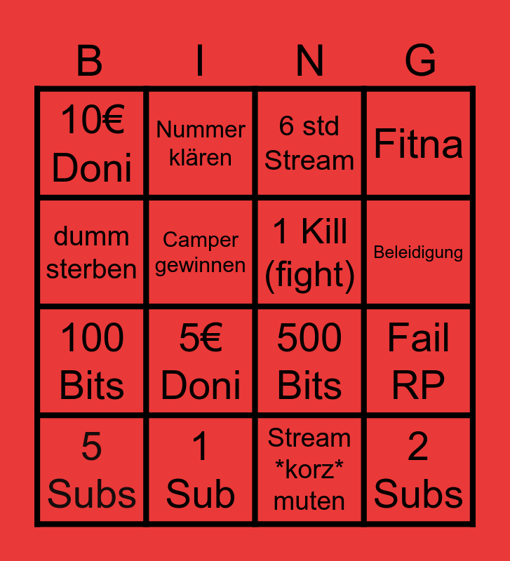 This bingo card has 16 words: 1 Sub, Fail RP, 6 std Stream, 10€ Doni, 100 Bits, Nummer klären, 500 Bits, Stream *korz* muten, dumm sterben, Camper gewinnen, 5 Subs, Fitna, 5€ Doni, Beleidigung, 1 Kill (fight) and 2 Subs.