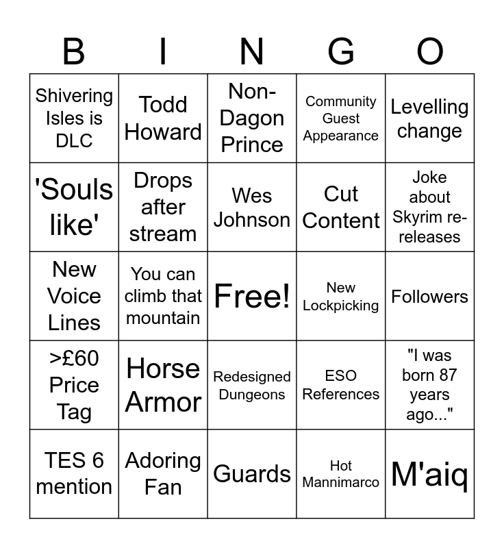 This bingo card has a free space and 24 words: Horse Armor, Adoring Fan, Wes Johnson, TES 6 mention, Levelling change, Shivering Isles is DLC, 'Souls like', Todd Howard, New Lockpicking, Redesigned Dungeons, Cut Content, New Voice Lines, ESO References, "I was born 87 years ago...", Drops after stream, Hot Mannimarco, Followers, Non-Dagon Prince, Joke about Skyrim re-releases, You can climb that mountain, M'aiq, >£60 Price Tag, Community Guest Appearance and Guards.