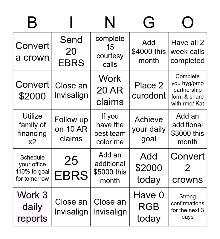 This bingo card has a free space and 24 words: 25 EBRS, Close an Invisalign, Work 20 AR claims, Work 3 daily reports, Have all 2 week calls completed, Convert a crown, Convert $2000, Send 20 EBRS, Achieve your daily goal, Add an additional $5000 this month, Place 2 curodont, Utilize family of financing x2, Add $2000 today, Convert 2 crowns, Close an Invisalign, Have 0 RGB today, Add an additional $3000 this month, complete 15 courtesy calls, Complete you hyg/pmo partnership form & share with rmo/ Kat, Follow up on 10 AR claims, Strong confirmations for the next 3 days, Schedule your office 110% to goal for tomorrow, Add $4000 this month and Close an Invisalign.