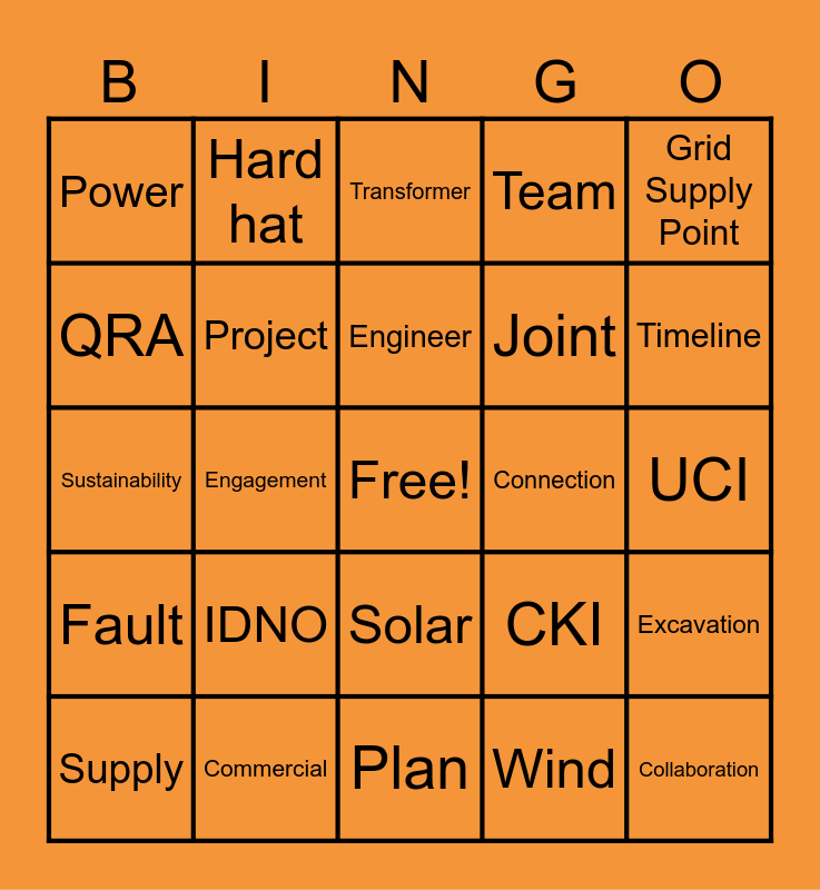 This bingo card has a free space and 84 words: Safety, Cable, Transformer, Electricity, Switchgear, SAP, Outage, Basil, Roger, Nigel, LPN, SPN, Project, Connection, Voltage, Power, Supply, QRA, Budget, Pole, Linesman, Joint, Collaboration, Construction, Engagement, Airline, LTI, CMI, CML, Regulations, IDNO, Risk, Environment, Sustainability, Spreadsheet, Nudge, Plan, P6, Timeline, Fault, Pylon, ADMS, Gloves, Procurement, Boots, High Vis, Hard hat, Overalls, EPN, Safety Glasses, Hong Kong, CKI, Team, Capital Programme, Delivery, Compliance, Commercial, Engineer, Consents, UCI, Living Our Values, Respect, Unity, The Volt, GIS, AIS, ABSD, RIGS, Grid Supply Point, Substation, Excavation, Commissioning, Contractor, Ring Main Unit, Solar, Wind, ICP, Contestable, Efficiency, OFGEM, ED2, Alpha state, Design and Governance.