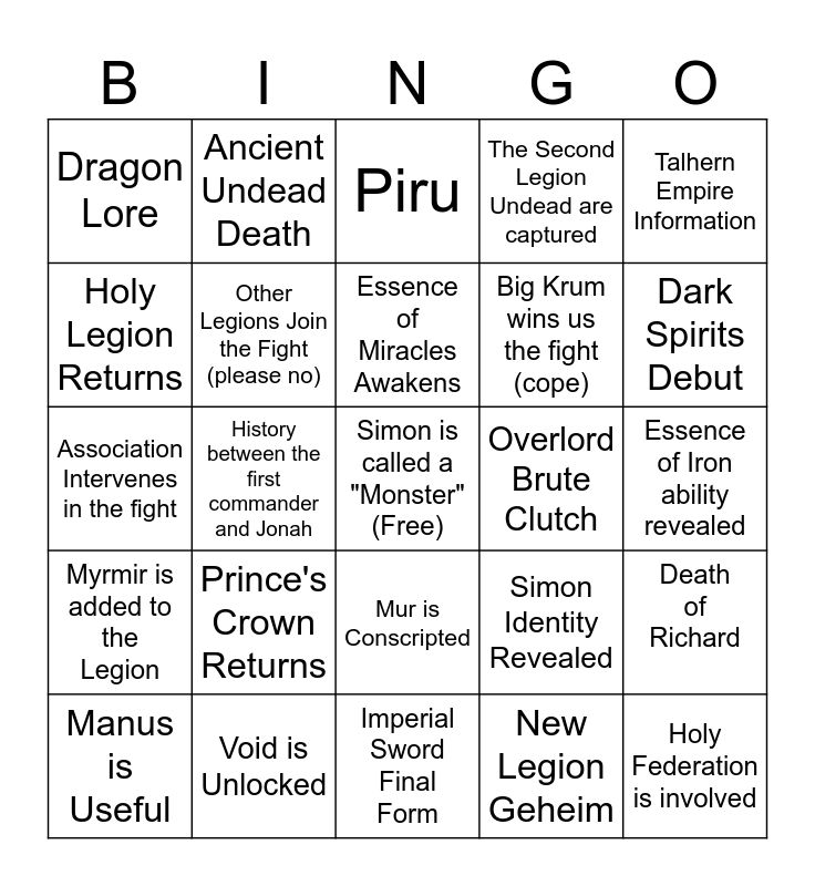 This bingo card has a free space and 24 words: Prince's Crown Returns, Void is Unlocked, Essence of Miracles Awakens, Manus is Useful, Talhern Empire Information, Dragon Lore, Holy Legion Returns, Ancient Undead Death, Overlord Brute Clutch, Mur is Conscripted, Big Krum wins us the fight (cope), Association Intervenes in the fight, Simon Identity Revealed, Death of Richard, Other Legions Join the Fight (please no), New Legion Geheim, Essence of Iron ability revealed, Piru, Dark Spirits Debut, History between the first commander and Jonah, Holy Federation is involved, Myrmir is added to the Legion, The Second Legion Undead are captured and Imperial Sword Final Form.