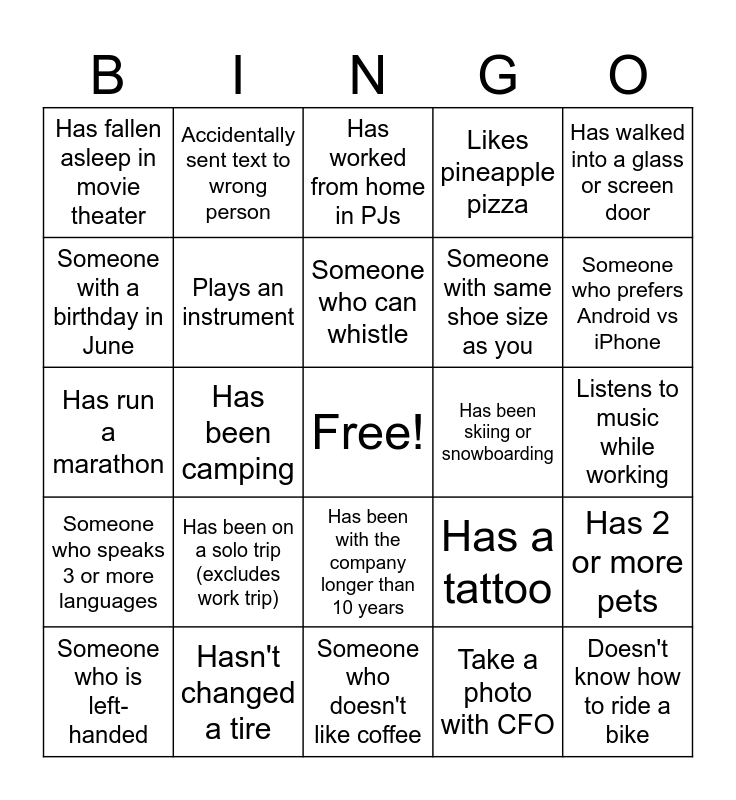 This bingo card has a free space and 24 words: Has been on a solo trip (excludes work trip), Hasn't changed a tire, Someone who can whistle, Someone who is left-handed, Has walked into a glass or screen door, Has fallen asleep in movie theater, Someone with a birthday in June, Accidentally sent text to wrong person, Has been skiing or snowboarding, Has been with the company longer than 10 years, Someone with same shoe size as you, Has run a marathon, Has a tattoo, Has 2 or more pets, Plays an instrument, Take a photo with CFO, Listens to music while working, Has worked from home in PJs, Someone who prefers Android vs iPhone, Has been camping, Doesn't know how to ride a bike, Someone who speaks 3 or more languages, Likes pineapple pizza and Someone who doesn't like coffee.