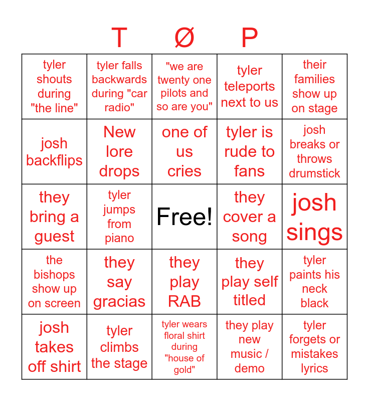 This bingo card has a free space and 24 words: they say gracias, tyler climbs the stage, one of us cries, josh takes off shirt, their families show up on stage, tyler shouts during "the line", josh backflips, tyler falls backwards during "car radio", they cover a song, they play RAB, tyler is rude to fans, they bring a guest, they play self titled, tyler paints his neck black, New lore drops, they play new music / demo, josh sings, "we are twenty one pilots and so are you", josh breaks or throws drumstick, tyler jumps from piano, tyler forgets or mistakes lyrics, the bishops show up on screen, tyler teleports next to us and tyler wears floral shirt during "house of gold".