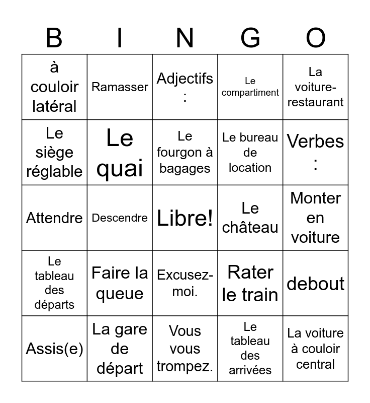 This bingo card has a free space and 60 words: La gare de départ La gare d’arrivée Le tableu des départs Le tableau des arrivées La ligne Le quai La voie Le bureau de location Le couloir Le compartiment La place numérotée Le siège réglable La tablette rabattable Le wagon à compartiments, La gare de départ, La gare d’arrivée, Le tableau des départs, Le tableau des arrivées, La ligne de banlieue, Le quai, La voie, Le bureau de location, Le couloir, Le compartiment, La place numérotée, Le siège réglable, La tablette rabattable, Le wagon à compartiments, à couloir latéral, La voiture à couloir central, La voiture-restaurant, La voiture gril-express, Le fourgon à bagages, Le château, Adjectifs :, Assis(e), debout, Complet, complète, Disponible, Prochain(e), Nombreux, nombreuse, Verbes :, Louer, Réserver, Chercher, Emporter, Vérifier, Ramasser, Poinçonner, S’arrêter, Descendre, Desservir, Attendre, Autres mots et expressions :, Faire la queue, Monter en voiture, Changer de train, Rater le train, Acheter le billet, Polite expressions:, Attention à la fermeture des portes !, Attention au départ !, Excusez-moi., Vous vous trompez., Ce n’est pas grave., Vous permettez ?, à l’avance, à l’arrière, debout, fréquemment, rarement, en face de and de temps en temps.