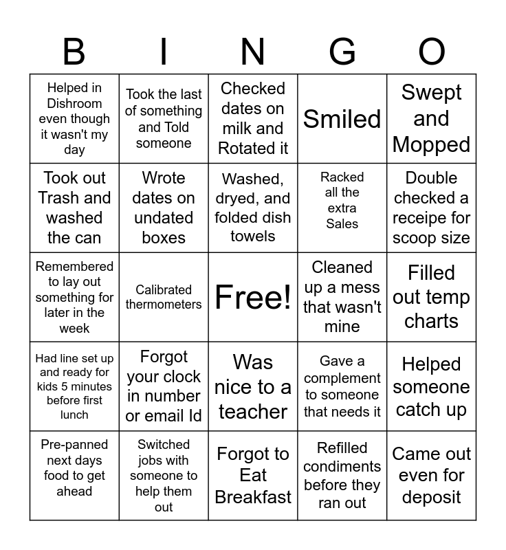 This bingo card has a free space and 24 words: Forgot your clock in number or email Id, Switched jobs with someone to help them out, Washed, dryed, and folded dish towels, Pre-panned next days food to get ahead, Swept and Mopped, Helped in Dishroom even though it wasn't my day, Took out Trash and washed the can, Took the last of something and Told someone, Cleaned up a mess that wasn't mine, Was nice to a teacher, Racked all the extra Sales, Remembered to lay out something for later in the week, Gave a complement to someone that needs it, Helped someone catch up, Wrote dates on undated boxes, Refilled condiments before they ran out, Filled out temp charts, Checked dates on milk and Rotated it, Double checked a receipe for scoop size, Calibrated thermometers, Came out even for deposit, Had line set up and ready for kids 5 minutes before first lunch, Smiled and Forgot to Eat Breakfast.