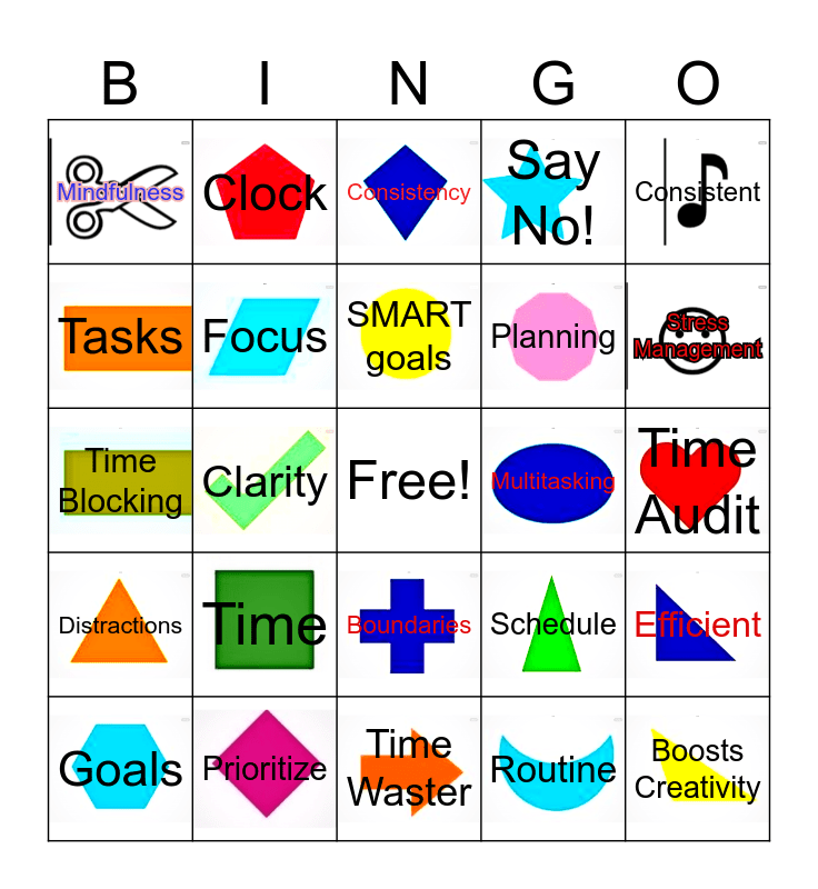 This bingo card has 24 images, a free space and 24 words: Time, Prioritize, SMART goals, Goals, Consistent, Mindfulness, Tasks, Clock, Multitasking, Boundaries, Planning, Time Blocking, Schedule, Efficient, Focus, Routine, Time Audit, Consistency, Stress Management, Clarity, Boosts Creativity, Distractions, Say No! and Time Waster.