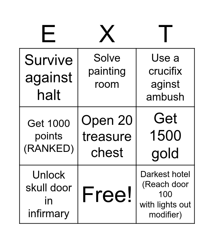 This bingo card has a free space and 8 words: Get 1500 gold, Use a crucifix aginst ambush, Solve painting room, Unlock skull door in infirmary, Survive against halt, Darkest hotel (Reach door 100 with lights out modifier), Get 1000 points (RANKED) and Free!.