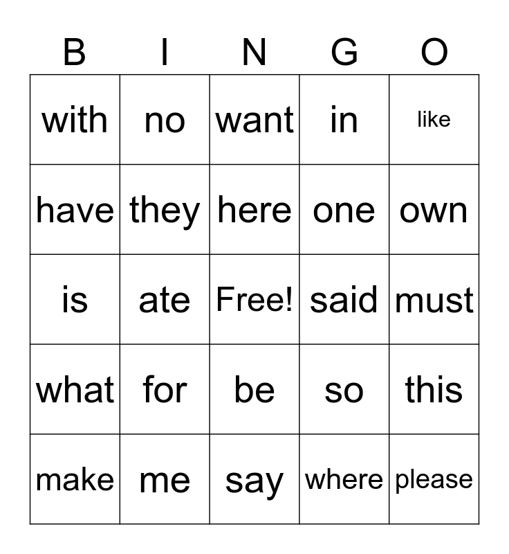 This bingo card has a free space and 24 words: for, me, here, make, like, with, have, no, said, be, one, is, so, this, they, where, must, want, own, ate, please, what, in and say.