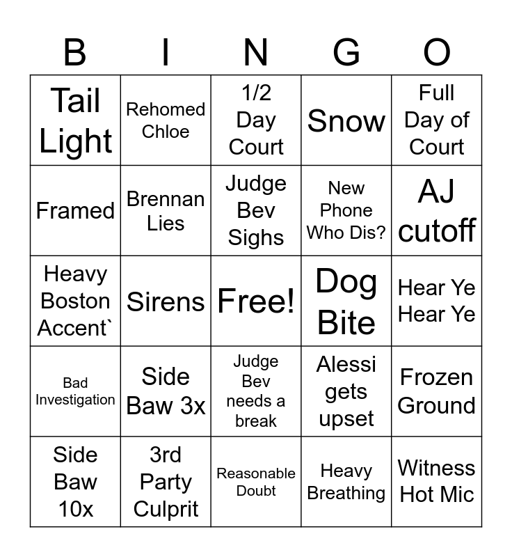 This bingo card has a free space and 24 words: Side Baw 3x, 3rd Party Culprit, Judge Bev Sighs, Side Baw 10x, Full Day of Court, Tail Light, Framed, Rehomed Chloe, Dog Bite, Judge Bev needs a break, New Phone Who Dis?, Heavy Boston Accent`, Alessi gets upset, Frozen Ground, Brennan Lies, Heavy Breathing, Hear Ye Hear Ye, 1/2 Day Court, AJ cutoff, Sirens, Witness Hot Mic, Bad Investigation, Snow and Reasonable Doubt.