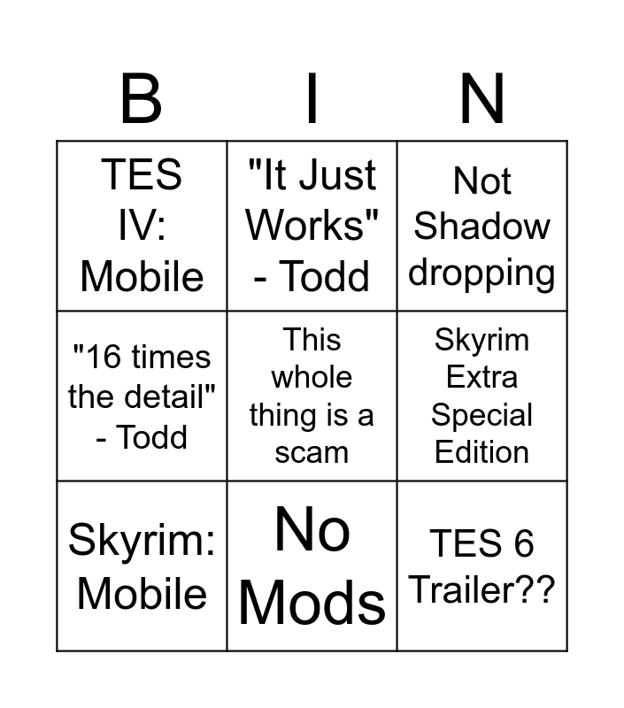 This bingo card has a free space and 8 words: Skyrim Extra Special Edition, Not Shadow dropping, "It Just Works" - Todd, Skyrim: Mobile, TES IV: Mobile, TES 6 Trailer??, "16 times the detail" - Todd and No Mods.