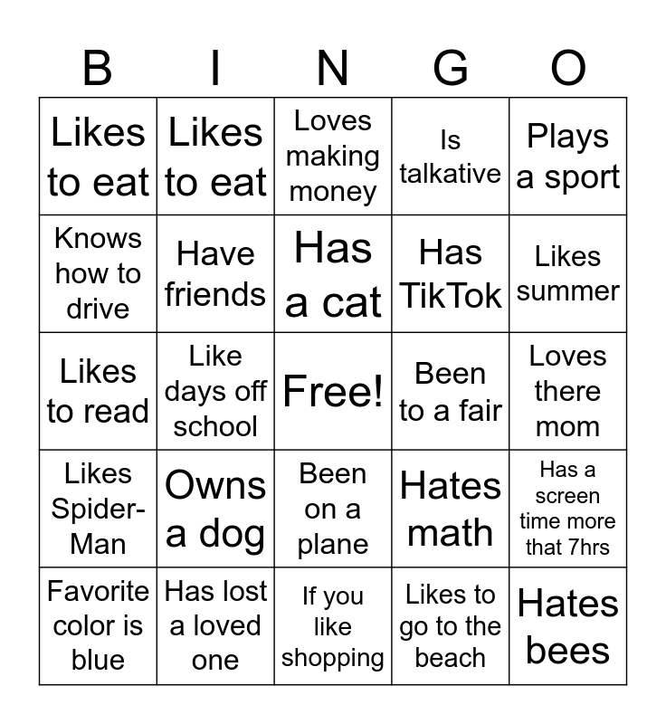 This bingo card has a free space and 24 words: Owns a dog, Has lost a loved one, Has a cat, Favorite color is blue, Plays a sport, Likes to eat, Knows how to drive, Likes to eat, Been to a fair, Been on a plane, Has TikTok, Likes to read, Hates math, Has a screen time more that 7hrs, Have friends, Likes to go to the beach, Loves there mom, Loves making money, Likes summer, Like days off school, Hates bees, Likes Spider-Man, Is talkative and If you like shopping.