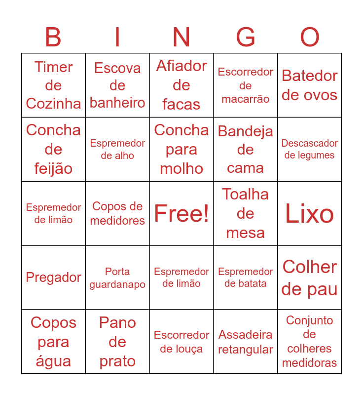 This bingo card has a free space and 74 words: Abridor de garrafas e latas, Açucareiro, Afiador de facas, Assadeiras, Avental, Batedor de ovos manual/Fouet, Tigela de inox, Bule de chá/café, Copos para água, Colher de pau, Colher para servir, Concha para sorvete, Concha para molho, Concha de feijão, Cortador de pizza, Copos de medidores, Descanso de panelas, Descascador de legumes, Espremedor de batatas, Espremedor de limão, Espremedor de alho, Escova de banheiro, Escorredor de macarrão, Escorredor de arroz, Conjunto de colheres medidoras, Espátula de silicone, Abridor de Latas, Ralador, Descascador de legumes, Peneiras, Batedor de ovos, Tesoura de cozinha, Saca rolhas, Forma de gelo, Forma para bolo, Assadeira retangular, Forma para Pudim, Garrafa de café, Saleiro, Porta papel toalha, Escorredor de louça, Pano de prato, Avental, Luva Térmica, Porta temperos, Timer de Cozinha, Tábua de corte, Porta guardanapo, Jogo de tapete, Kit jogo de banheiro, Vassoura rodo pá, Frigideira, Lixo, Cesto de roupa, Kit cozinha porta detergente Rodo..., kit de faca, Espremedor de limão, Pegador de sorvete, Descascador, Colher de pau, Bandeja de cama, Funil, Pregador, Paliteiro, Toalha de mesa, Pano de chão, Porta sabão em pó, Escorredor de macarrão, Espremedor de batata, descanso de panela, Escorredor de arroz, Copo medidor, Afiador de faca and Cortador de pizza.