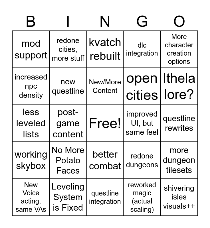 This bingo card has a free space and 24 words: No More Potato Faces, Leveling System is Fixed, New/More Content, New Voice acting, same VAs, More character creation options, mod support, increased npc density, redone cities, more stuff, improved UI, but same feel, better combat, open cities, less leveled lists, redone dungeons, more dungeon tilesets, new questline, reworked magic (actual scaling), questline rewrites, kvatch rebuilt, Ithela lore?, post-game content, shivering isles visuals++, working skybox, dlc integration and questline integration.