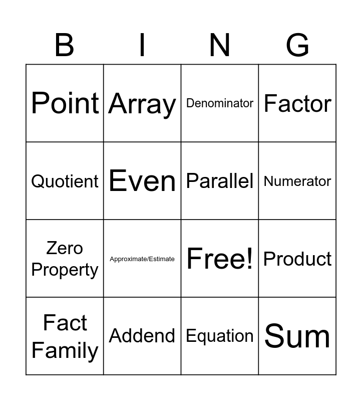 This bingo card has 21 words: Addend, Area, Array, Associative Property, Equation, Parallel, Point, Denominator, Free!, Numerator, Zero Property, Factor, Sum, Divisor, Even, Odd, Fact Family, Approximate/Estimate, Quotient, Product and Difference.