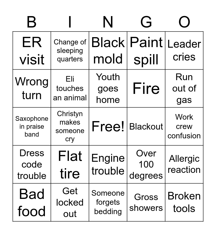 This bingo card has a free space and 24 words: Flat tire, Get locked out, Youth goes home, Bad food, Leader cries, ER visit, Wrong turn, Change of sleeping quarters, Blackout, Engine trouble, Fire, Saxophone in praise band, Over 100 degrees, Allergic reaction, Eli touches an animal, Gross showers, Work crew confusion, Black mold, Run out of gas, Christyn makes someone cry, Broken tools, Dress code trouble, Paint spill and Someone forgets bedding.