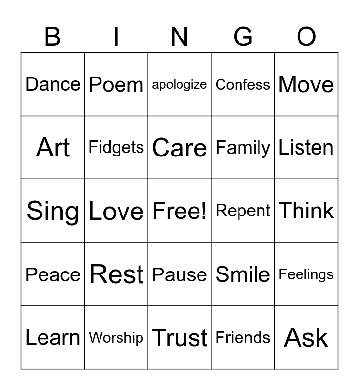 This bingo card has a free space and 42 words: Kindness, Care, Commune, Rest, Friends, Feelings, Ask, Help, apologize, Pause, Think, Listen, Love, Move, Pray, Smile, Imagine, Sing, Write, Poem, Art, read, Run, Dance, Stretch, Talk, Family, Cry, Thankful, Play, Self care, Peace, Fidgets, Trust, Believe, Learn, Worship, Repent, Belong, Gather, Confess and Pause.