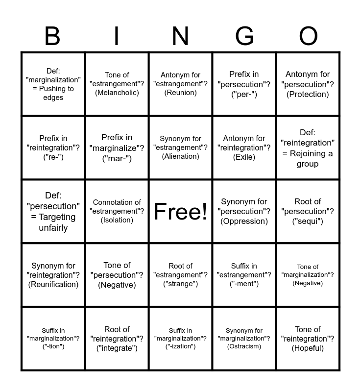 This bingo card has a free space and 24 words: Tone of "persecution"? (Negative), Root of "reintegration"? ("integrate"), Synonym for "estrangement"? (Alienation), Suffix in "marginalization"? ("-tion"), Antonym for "persecution"? (Protection), Def: "marginalization" = Pushing to edges, Prefix in "reintegration"? ("re-"), Tone of "estrangement"? (Melancholic), Synonym for "persecution"? (Oppression), Root of "estrangement"? ("strange"), Antonym for "reintegration"? (Exile), Def: "persecution" = Targeting unfairly, Suffix in "estrangement"? ("-ment"), Tone of "marginalization"? (Negative), Prefix in "marginalize"? ("mar-"), Synonym for "marginalization"? (Ostracism), Root of "persecution"? ("sequi"), Antonym for "estrangement"? (Reunion), Def: "reintegration" = Rejoining a group, Connotation of "estrangement"? (Isolation), Tone of "reintegration"? (Hopeful), Synonym for "reintegration"? (Reunification), Prefix in "persecution"? ("per-") and Suffix in "marginalization"? ("-ization").