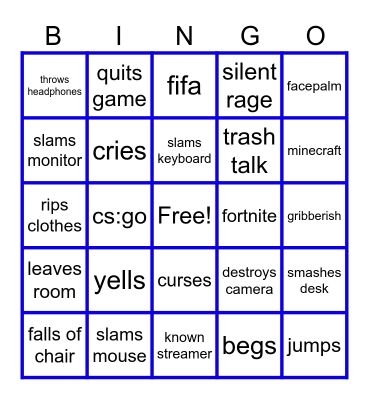 This bingo card has a free space and 24 words: yells, slams mouse, slams keyboard, falls of chair, facepalm, throws headphones, slams monitor, quits game, fortnite, curses, trash talk, rips clothes, destroys camera, smashes desk, cries, begs, gribberish, fifa, minecraft, cs:go, jumps, leaves room, silent rage and known streamer.