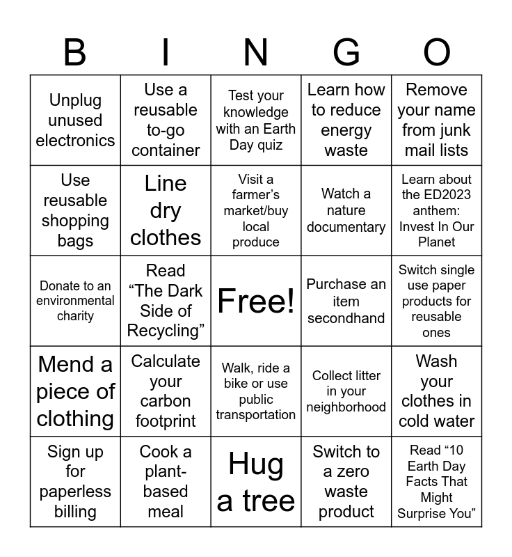 This bingo card has a free space and 24 words: Calculate your carbon footprint, Cook a plant-based meal, Visit a farmer’s market/buy local produce, Sign up for paperless billing, Remove your name from junk mail lists, Unplug unused electronics, Use reusable shopping bags, Use a reusable to-go container, Purchase an item secondhand, Walk, ride a bike or use public transportation, Watch a nature documentary, Donate to an environmental charity, Collect litter in your neighborhood, Wash your clothes in cold water, Line dry clothes, Switch to a zero waste product, Switch single use paper products for reusable ones, Test your knowledge with an Earth Day quiz, Learn about the ED2023 anthem: Invest In Our Planet, Read “The Dark Side of Recycling”, Read “10 Earth Day Facts That Might Surprise You”, Mend a piece of clothing, Learn how to reduce energy waste and Hug a tree.