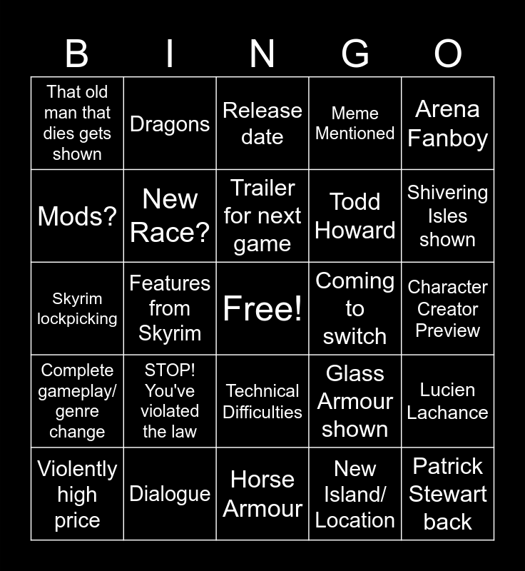 This bingo card has a free space and 24 words: STOP! You've violated the law, Dialogue, Trailer for next game, Violently high price, Arena Fanboy, That old man that dies gets shown, Mods?, Dragons, Coming to switch, Technical Difficulties, Todd Howard, Skyrim lockpicking, Glass Armour shown, Lucien Lachance, New Race?, New Island/ Location, Character Creator Preview, Release date, Shivering Isles shown, Features from Skyrim, Patrick Stewart back, Complete gameplay/ genre change, Meme Mentioned and Horse Armour.
