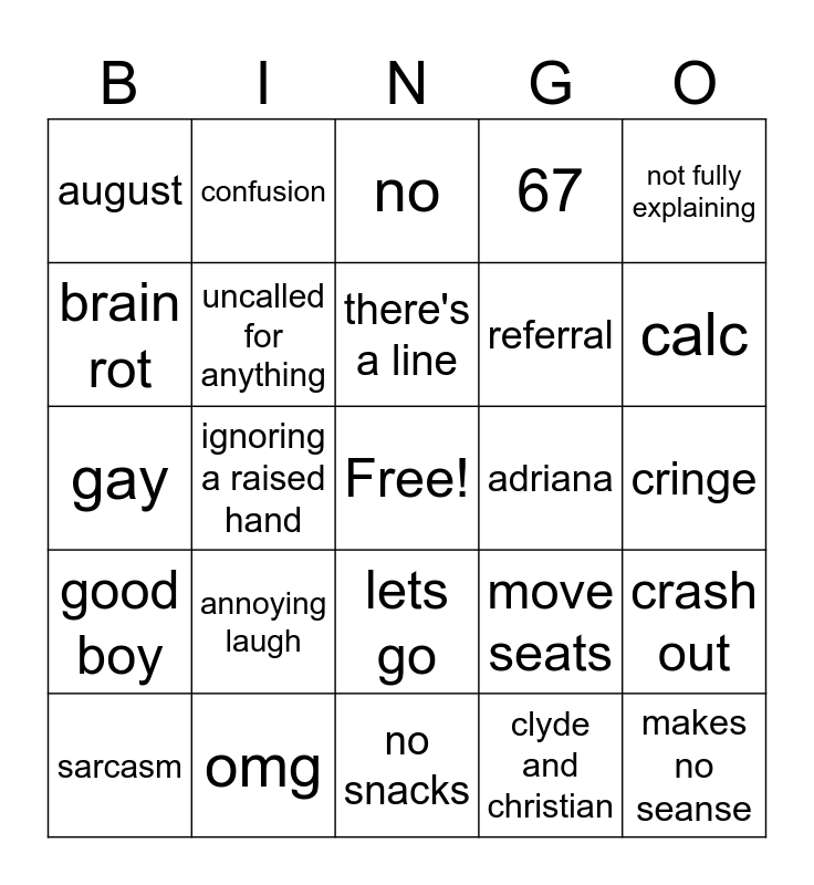 This bingo card has a free space and 24 words: annoying laugh, omg, there's a line, sarcasm, not fully explaining, august, brain rot, confusion, adriana, lets go, referral, gay, move seats, crash out, uncalled for anything, clyde and christian, cringe, no, calc, ignoring a raised hand, makes no seanse, good boy, 67 and no snacks.