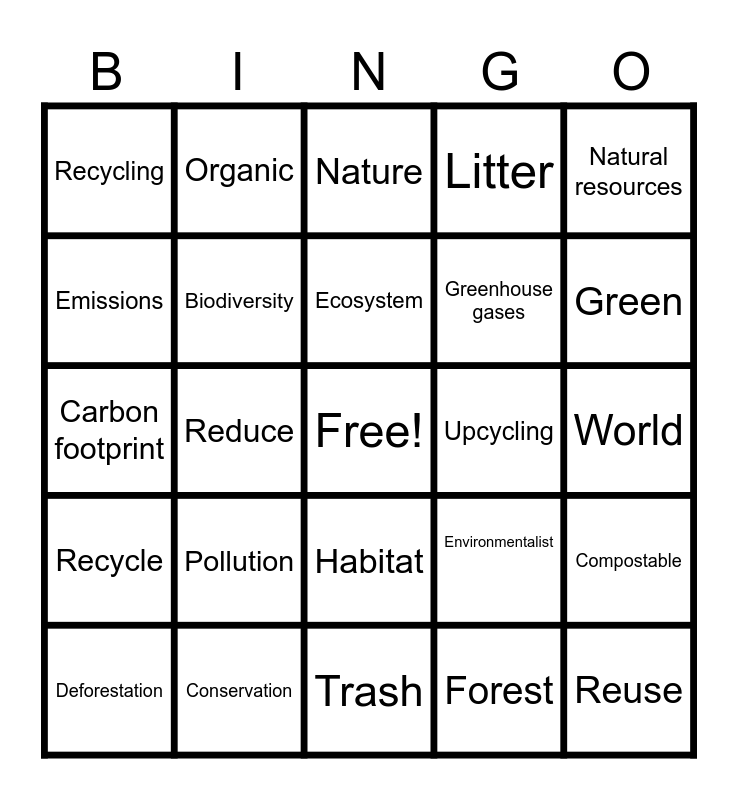 This bingo card has a free space and 24 words: Pollution, Conservation, Ecosystem, Deforestation, Natural resources, Recycling, Emissions, Organic, Upcycling, Habitat, Greenhouse gases, Carbon footprint, Environmentalist, Compostable, Biodiversity, Forest, World, Nature, Green, Reduce, Reuse, Recycle, Litter and Trash.