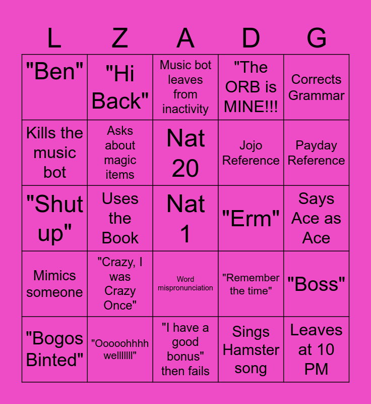 This bingo card has 25 words: Mimics someone, "Ooooohhhh welllllll", Nat 1, Sings Hamster song, Corrects Grammar, "Ben", "Hi Back", Music bot leaves from inactivity, "Erm", "Boss", Kills the music bot, Asks about magic items, "I have a good bonus" then fails, "Remember the time", Payday Reference, "Bogos Binted", Uses the Book, Nat 20, Jojo Reference, Says Ace as Ace, "Shut up", "Crazy, I was Crazy Once", Word mispronunciation, "The ORB is MINE!!! and Leaves at 10 PM.