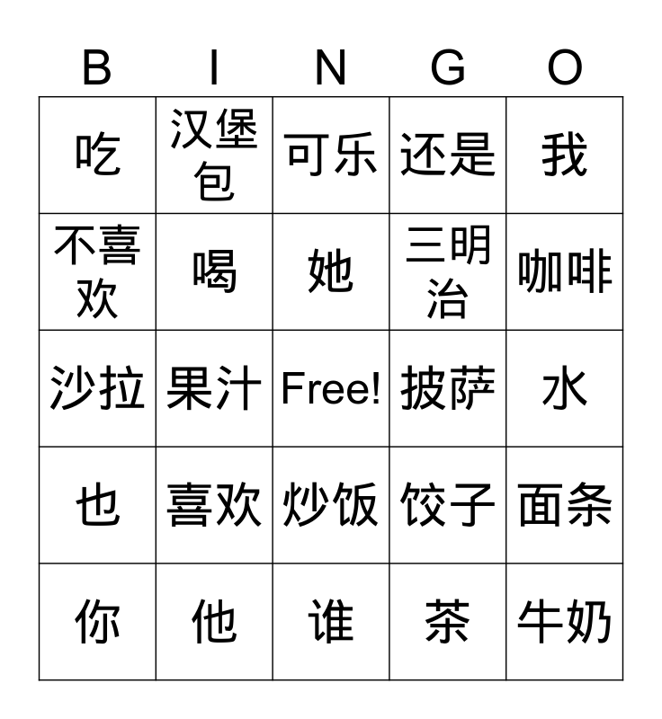 This bingo card has a free space and 24 words: 喜欢, 他, 她, 你, 我, 吃, 不喜欢, 汉堡包, 披萨, 炒饭, 三明治, 沙拉, 饺子, 面条, 喝, 茶, 水, 可乐, 咖啡, 果汁, 牛奶, 也, 还是 and 谁.