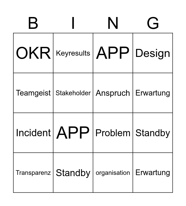This bingo card has 30 words: Performance, customer meeting point, Standby, Titan, OKR, APP, Anspruch, Erwartung, Standby, Stakeholder, organisation, Transparenz, OKR, Kundenzufriedenheit, APP, Titan, Einsatz, Erwartung, Meeting, Teamgeist, Problem, Erreichbarkeit, Keyresults, Incident, Stakeholder, Design, Transparenz, Anspruch, Erwartung and Organisation.