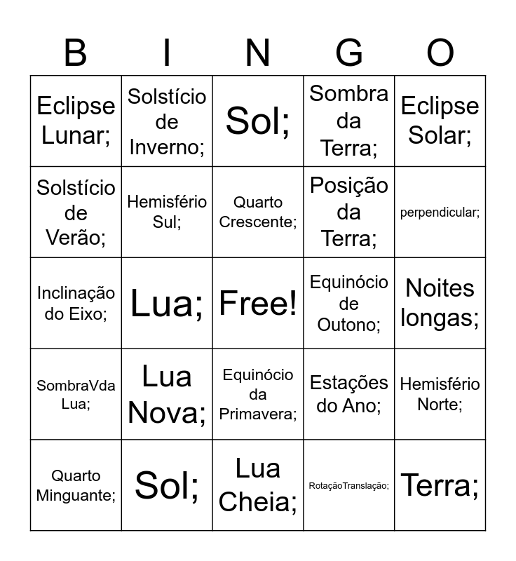 This bingo card has a free space and 25 words: Lua Nova;, Lua Cheia;, Quarto Crescente;, Quarto Minguante;, Eclipse Solar;, Eclipse Lunar;, Solstício de Verão;, Solstício de Inverno;, Equinócio de Outono;, Equinócio da Primavera;, Posição da Terra;, Inclinação do Eixo;, Estações do Ano;, Hemisfério Norte;, Hemisfério Sul;, Dias longos;, Noites longas;, Sol;, perpendicular;, Lua;, Terra;, Sol;, SombraVda Lua;, Sombra da Terra; and RotaçãoTranslação;.