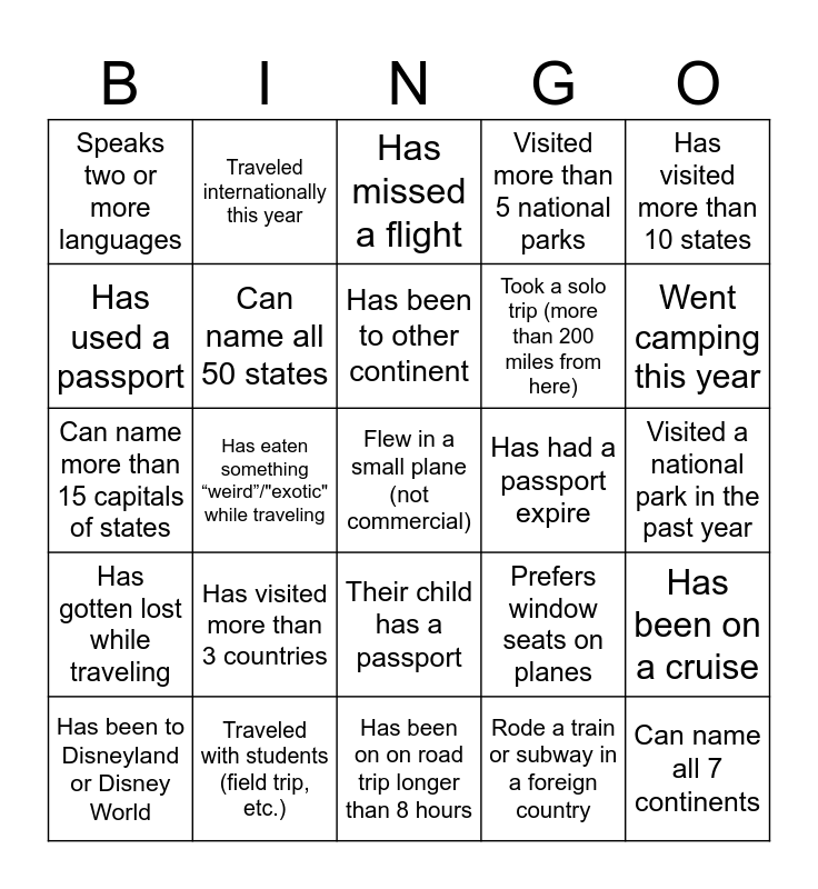 This bingo card has 25 words: Has visited more than 3 countries, Has been on on road trip longer than 8 hours, Has been to other continent, Has been to Disneyland or Disney World, Has visited more than 10 states, Speaks two or more languages, Has used a passport, Traveled internationally this year, Has had a passport expire, Their child has a passport, Took a solo trip (more than 200 miles from here), Can name more than 15 capitals of states, Prefers window seats on planes, Has been on a cruise, Can name all 50 states, Can name all 7 continents, Visited a national park in the past year, Has missed a flight, Went camping this year, Has eaten something “weird”/"exotic" while traveling, Flew in a small plane (not commercial), Traveled with students (field trip, etc.), Has gotten lost while traveling, Visited more than 5 national parks and Rode a train or subway in a foreign country.