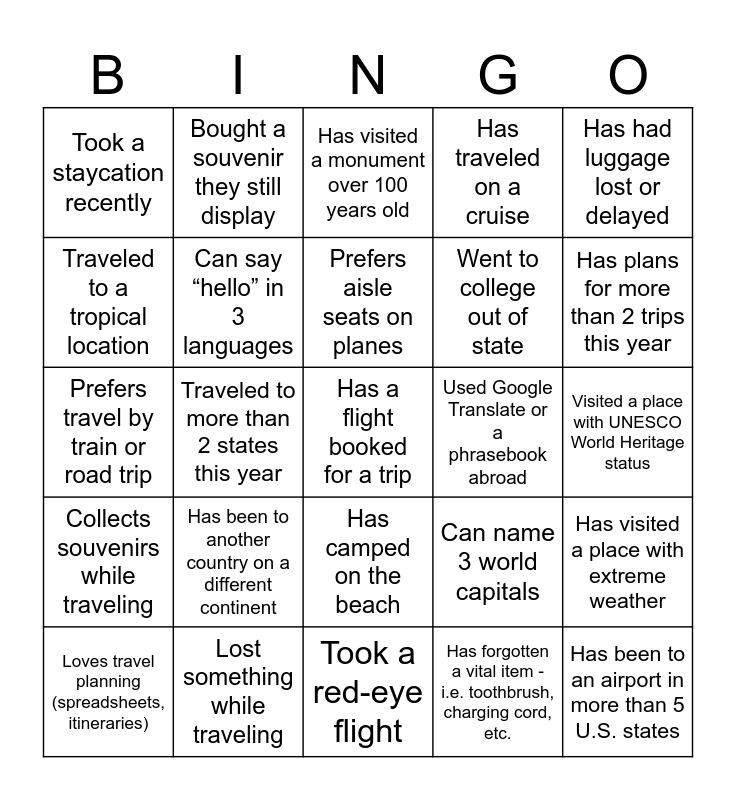 This bingo card has 25 words: Has been to another country on a different continent, Took a red-eye flight, Prefers aisle seats on planes, Loves travel planning (spreadsheets, itineraries), Has had luggage lost or delayed, Took a staycation recently, Traveled to a tropical location, Bought a souvenir they still display, Used Google Translate or a phrasebook abroad, Has camped on the beach, Went to college out of state, Prefers travel by train or road trip, Can name 3 world capitals, Has visited a place with extreme weather, Can say “hello” in 3 languages, Has been to an airport in more than 5 U.S. states, Visited a place with UNESCO World Heritage status, Has visited a monument over 100 years old, Has plans for more than 2 trips this year, Traveled to more than 2 states this year, Has a flight booked for a trip, Lost something while traveling, Collects souvenirs while traveling, Has traveled on a cruise and Has forgotten a vital item - i.e. toothbrush, charging cord, etc..