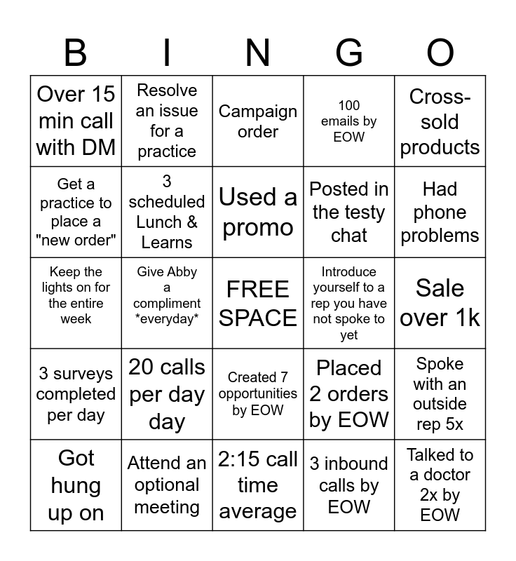 This bingo card has a free space and 24 words: 20 calls per day day, Attend an optional meeting, Used a promo, Got hung up on, Cross-sold products, Over 15 min call with DM, Get a practice to place a "new order", Resolve an issue for a practice, Introduce yourself to a rep you have not spoke to yet, Created 7 opportunities by EOW, Posted in the testy chat, Keep the lights on for the entire week, Placed 2 orders by EOW, Spoke with an outside rep 5x, 3 scheduled Lunch & Learns, 3 inbound calls by EOW, Sale over 1k, Campaign order, Had phone problems, Give Abby a compliment *everyday*, Talked to a doctor 2x by EOW, 3 surveys completed per day, 100 emails by EOW and 2:15 call time average.