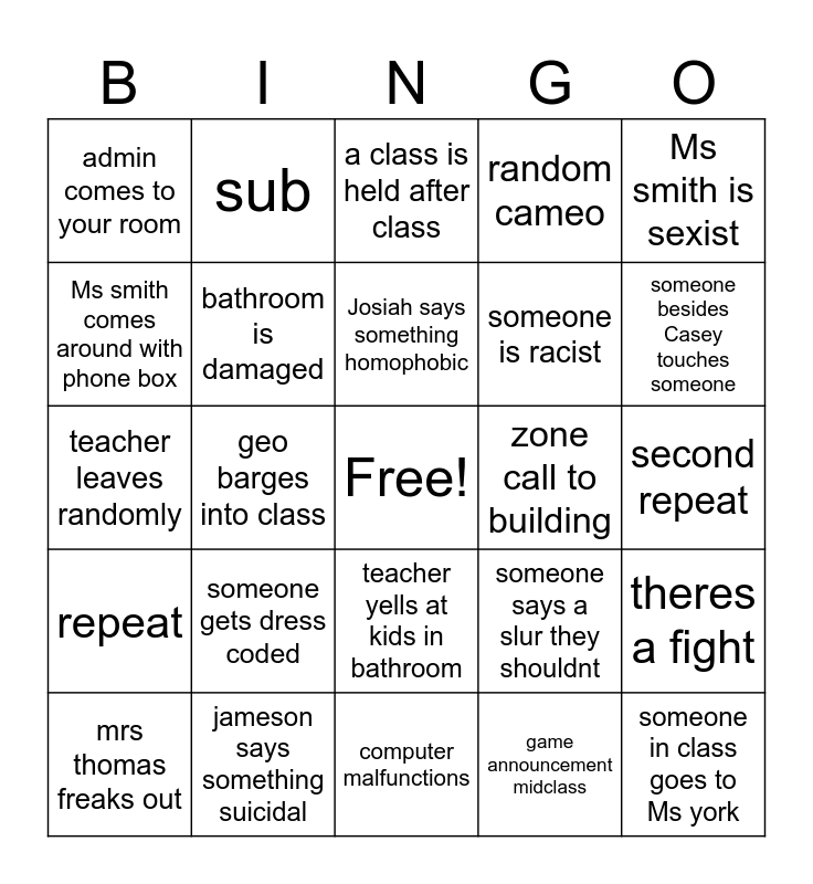 This bingo card has a free space and 24 words: someone gets dress coded, jameson says something suicidal, Josiah says something homophobic, mrs thomas freaks out, Ms smith is sexist, admin comes to your room, Ms smith comes around with phone box, sub, zone call to building, teacher yells at kids in bathroom, someone is racist, teacher leaves randomly, someone says a slur they shouldnt, theres a fight, bathroom is damaged, game announcement midclass, second repeat, a class is held after class, someone besides Casey touches someone, geo barges into class, someone in class goes to Ms york, repeat, random cameo and computer malfunctions.