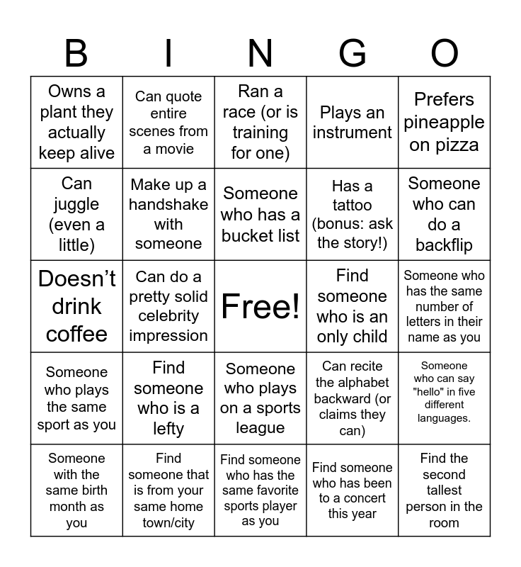 This bingo card has a free space and 29 words: Someone with the same birth month as you, Speaks more than one language fluently, Can do a pretty solid celebrity impression, Has traveled to more than 5 countries, Owns a plant they actually keep alive, Ran a race (or is training for one), Make up a handshake with someone, Find someone who is a lefty, Find someone who is an only child, Find someone that is from your same home town/city, Someone who has the same number of letters in their name as you, Find the second tallest person in the room, Find someone who has the same favorite sports player as you, Find someone who has been to a concert this year, Someone who can do a backflip, Someone who has the same zodiac sign as you, Someone who plays on a sports league, Someone who plays the same sport as you, Prefers pineapple on pizza, Doesn’t drink coffee, Can recite the alphabet backward (or claims they can), Has met someone famous, Has a tattoo (bonus: ask the story!), Can juggle (even a little), Plays an instrument, Can quote entire scenes from a movie, Someone who can say "hello" in five different languages., Someone who has a bucket list and Prefers MacOS over Windows.