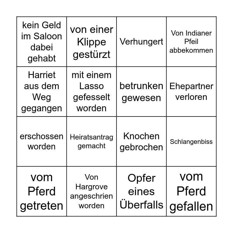 This bingo card has 16 words: Von Hargrove angeschrien worden, Schlangenbiss, Verhungert, kein Geld im Saloon dabei gehabt, erschossen worden, von einer Klippe gestürzt, Knochen gebrochen, Opfer eines Überfalls, Harriet aus dem Weg gegangen, mit einem Lasso gefesselt worden, vom Pferd getreten, Von Indianer Pfeil abbekommen, Heiratsantrag gemacht, Ehepartner verloren, betrunken gewesen and vom Pferd gefallen.